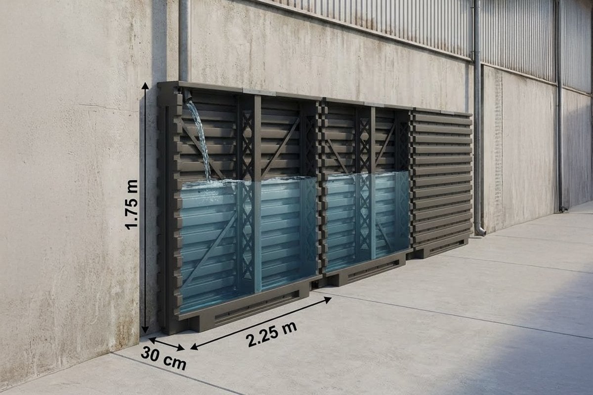 Dikey tasarımı, dar alanlarda da kullanıma imkan verir. Yağmur suyu duvarı, geleneksel su depolarına göre çok daha az yer kaplar. Verimliliği yüksektir.